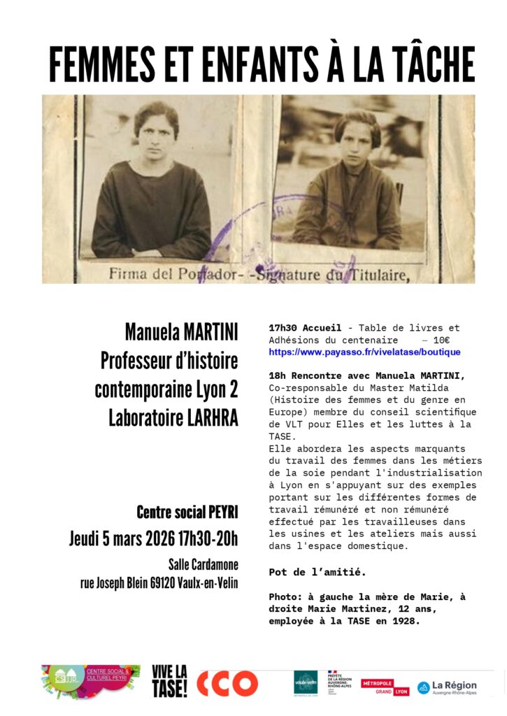 Pour rappel, Vive la TASE ! et le CCO La Rayonne sont engagés depuis 2025 dans une recherche historique, artistique et participative. Côté Vive la TASE !, les explorations sont centrées sur les femmes, leur rôle et leurs luttes collectives et individuelles : ouvrières, bien sûr, mais aussi ingénieures, institutrices, infirmières, grévistes, résistantes, sœurs, syndicalistes — toutes entraînées dans la grande histoire. Cette démarche est accompagnée par le Laboratoire de Recherche Historique Rhône-Alpes.