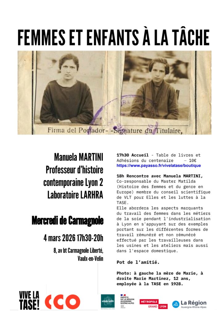 Pour rappel, Vive la TASE ! et le CCO La Rayonne sont engagés depuis 2025 dans une recherche historique, artistique et participative. Côté Vive la TASE !, les explorations sont centrées sur les femmes, leur rôle et leurs luttes collectives et individuelles : ouvrières, bien sûr, mais aussi ingénieures, institutrices, infirmières, grévistes, résistantes, sœurs, syndicalistes — toutes entraînées dans la grande histoire. Cette démarche est accompagnée par le Laboratoire de Recherche Historique Rhône-Alpes.
